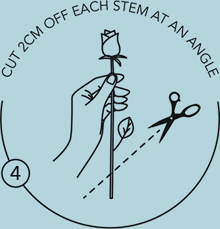 Use sharp scissors or a knife ideally, and cut 2cm off each stem at an angle. This will enable the roses to drink water and prevent ‘premature wilting’ – do not break or flatten the stems.
